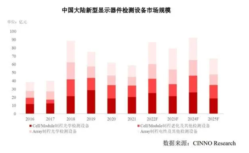 根據(jù) CINNO Research 報(bào)告,2021 年中國(guó)大陸新型顯示器件檢測(cè)設(shè)備市場(chǎng)規(guī)模約為 59 億元,其中 Cell/Module 制程檢測(cè)設(shè)備約為 34 億元。新的建廠和擴(kuò)產(chǎn)將帶動(dòng)檢測(cè)設(shè)備市場(chǎng)在 2024 年達(dá)到 92 億元,其中 Cell/Module 制程檢測(cè)設(shè)備市場(chǎng)規(guī)模在 2024 年將達(dá)到 46 億元。